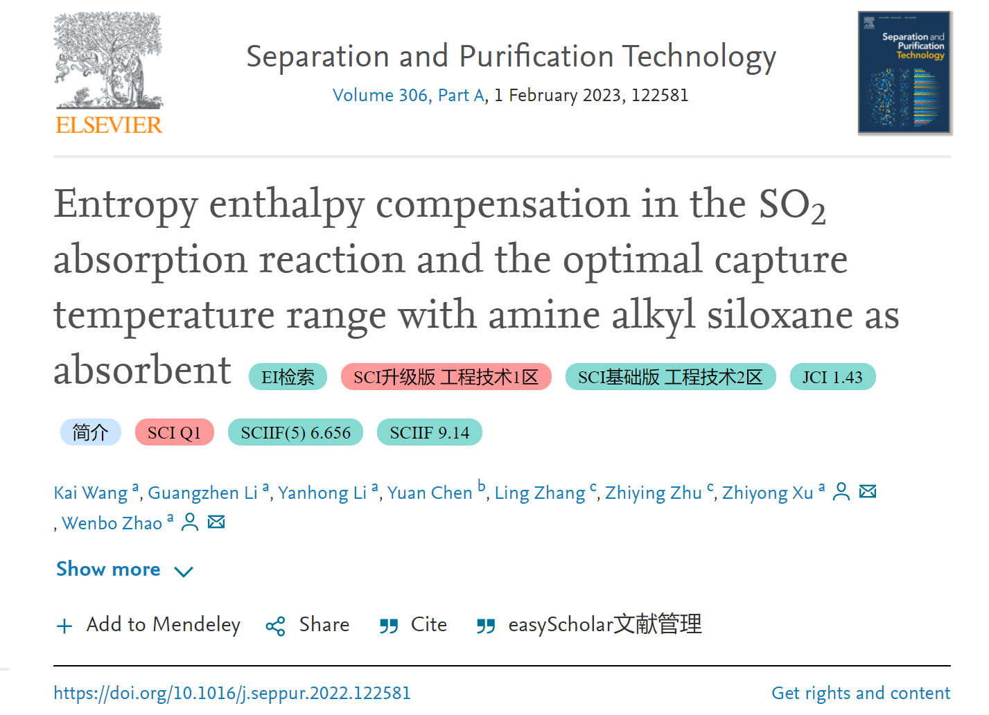 近日,趙文波教授課題組在SO2捕集方面的最新研究成果“Entropy enthalpy compensation in the SO2absorption reaction and the optimal capture temperature range with amine alkyl siloxane as absorbent”在化工領(lǐng)域國際Top學(xué)術(shù)期刊Separation and Purification Technology上發(fā)表。論文的第一作者為我院2020級碩士研究生王凱,通訊作者為趙文波教授,通訊單位為昆明理工大學(xué)化學(xué)工程學(xué)院。