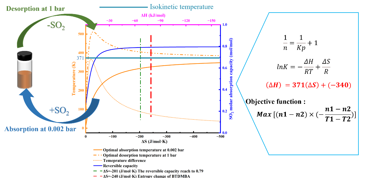 在此背景下,趙文波教授課題組根據(jù)有機硅化合物結(jié)構(gòu)可調(diào)的特點,設(shè)計了一系列用于吸收SO2的胺基硅氧烷。其中含有苯基的二丁基-(1,1,1-三甲基-3,3-二苯基二硅氧基甲基)-胺(DTMBA),由于分子中苯環(huán)引入的π-π作用,其熱穩(wěn)定性與離子液體和低共熔溶劑相當(dāng),同時兼具較低的粘度。胺基硅氧烷的反應(yīng)焓變和熵變比ILs反應(yīng)焓變和熵變更負(fù)。此外,胺基硅氧烷的焓變和熵變與文獻(xiàn)報道的吸收劑對比,發(fā)現(xiàn)了熵焓互補現(xiàn)象,獲得了相關(guān)方程