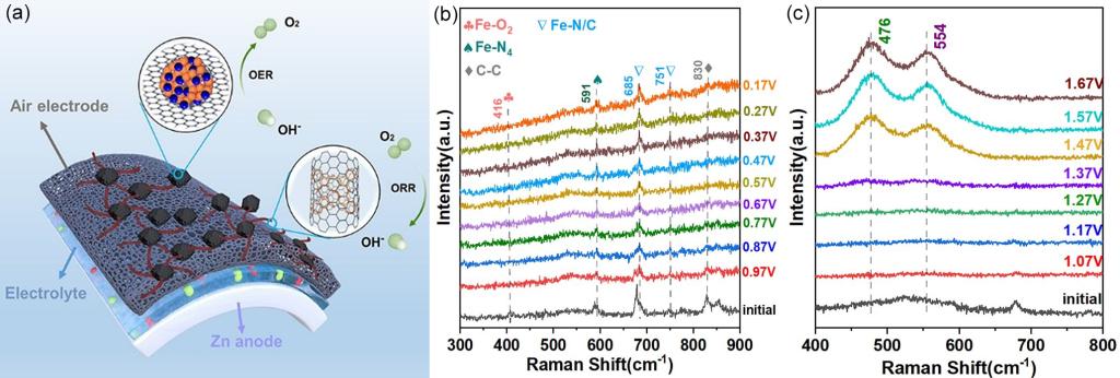 (3)以碳納米管為橋梁,其管壁上的摻雜氮原子橋接酞菁鐵分子(形成氧還原反應(yīng)Fe-N5活性位點),橋接的碳顆粒擔(dān)載NiCo納米顆粒(原位拉曼揭示納米顆粒會原位轉(zhuǎn)化為氫氧化物,即氧析出反應(yīng)的真正活性物質(zhì))。該催化劑表現(xiàn)出超高的氧電極活性(ΔE=0.686 V),鋅空電池輸出性能(功率為219.5 mW cm-2)和循環(huán)穩(wěn)定性能(700多次循環(huán)充放電性能無衰減)。相關(guān)成果以“Carbon-nanotube-bridging strategy for integrating single Fe atoms and NiCo nanoparticles in a bifunctional oxygen electrocatalyst toward high-efficiency and long-life rechargeable zinc–air batteries”為題發(fā)表在Advanced Energy Materials(IF=29.698)上,昆明理工大學(xué)化學(xué)工程學(xué)院碩士生何林為論文共同第一作者。論文鏈接:https://onlinelibrary.wiley.com/doi/10.1002/aenm.202202984