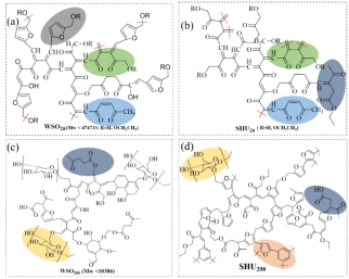 基于此背景,團(tuán)隊(duì)對(duì)高濃生物質(zhì)葡萄糖基于酸催化醇解制備乙酰丙酸酯的反應(yīng)行為、產(chǎn)物形成以及過程機(jī)理進(jìn)行了深入研究。對(duì)比發(fā)現(xiàn)當(dāng)葡萄糖底物濃度從20g/L提高至200g/L,會(huì)極大促進(jìn)可溶性低聚物的生成,而固體腐殖質(zhì)的生成量基本不變。當(dāng)?shù)孜餄舛壬吆螅磻?yīng)初始階段葡萄糖的自聚合反應(yīng)會(huì)加劇,同時(shí)反應(yīng)中間產(chǎn)物濃度的升高也會(huì)促使化學(xué)平衡偏向可溶性低聚物的形成,從而導(dǎo)致目標(biāo)產(chǎn)物乙酰丙酸酯的得率降低。研究進(jìn)一步對(duì)不同底物濃度葡萄糖反應(yīng)生成的可溶性低聚物和固體腐殖質(zhì)的結(jié)構(gòu)特點(diǎn)進(jìn)行了系統(tǒng)表征,獲得了相應(yīng)物質(zhì)的化學(xué)結(jié)構(gòu)模型,闡明了高濃葡萄糖醇解的反應(yīng)過程機(jī)理。研究結(jié)果可為高濃生物質(zhì)糖催化轉(zhuǎn)化選擇性制備高值能源化學(xué)品的途徑開發(fā)與策略構(gòu)建提供基礎(chǔ)理論指導(dǎo)。