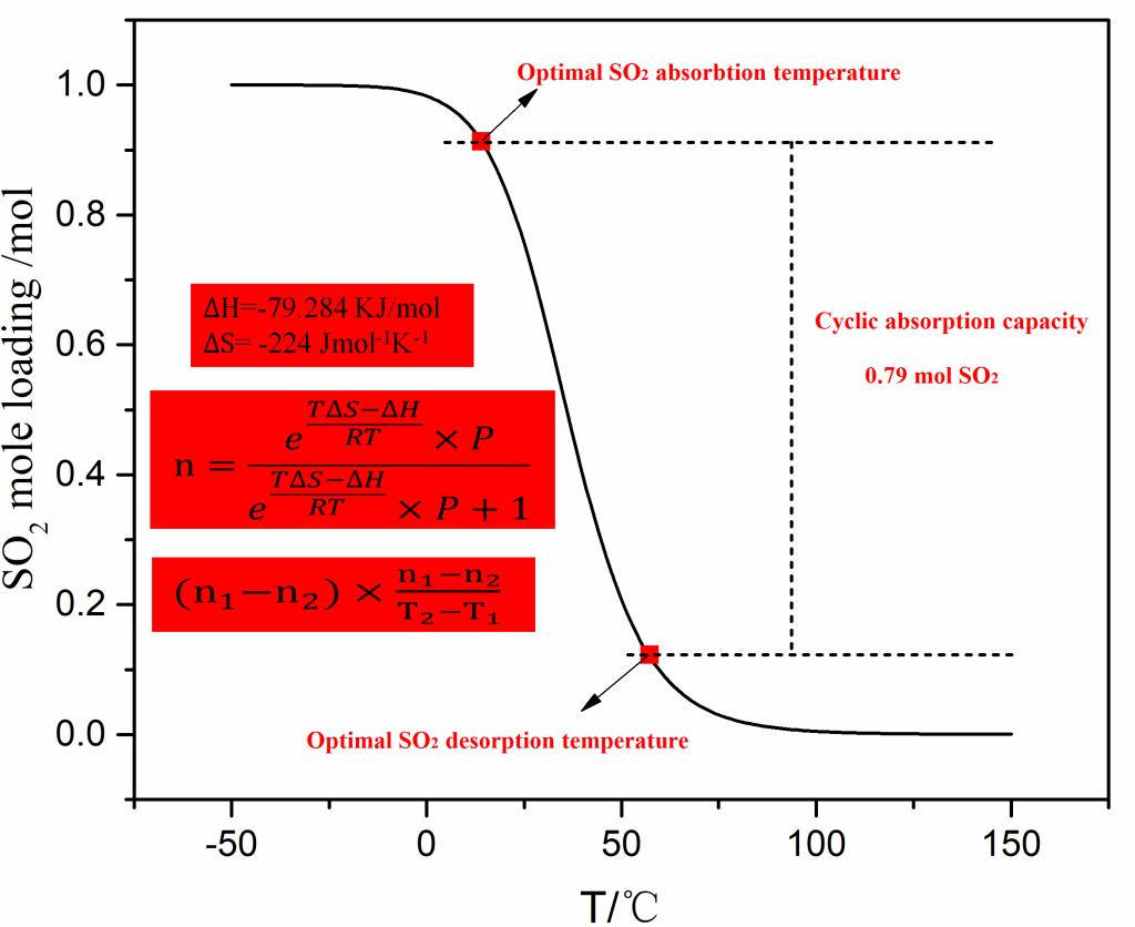 另外課題組通過兩步反應(yīng)合成了一種低粘度、高熱穩(wěn)定性的二丁基-(1,1-二甲基-3,3,3-三苯基-二硅氧烷基甲基)-胺(DDTDA)。發(fā)現(xiàn)其與SO2的反應(yīng)焓和熵變分別為-85.39 KJ/mol和-244 J mol-1K-1,其絕對值相比于DPSA得到進(jìn)一步增加。數(shù)學(xué)實驗證明,簡單地比較兩種吸收劑在一定溫度下的容量來評估它們的吸收性能是不科學(xué)的。不同的吸收劑具有不同的最佳捕集溫度范圍,該范圍由其反應(yīng)焓變和熵變決定。相關(guān)研究成果以“A standard function to evaluate optimal absorption and desorption temperature of SO2absorbent: Taking amine alkyl organosilicon as example”為題發(fā)表在化工領(lǐng)域國際Top學(xué)術(shù)期刊Separation and Purification Technology上(論文鏈接:https://doi.org/10.1016/j.seppur.2022.120634)。論文第一作者為我院2020級碩士研究生童向鑫,通訊作者為趙文波教授,通訊單位為昆明理工大學(xué)化學(xué)工程學(xué)院。