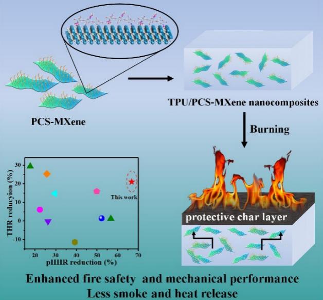 磷化工團(tuán)隊提出通過磷酸化殼聚糖功能化MXene阻燃熱塑性塑料,制備了一種具有高機(jī)械強(qiáng)度、阻燃和抑煙性能的熱塑性聚氨酯復(fù)合材料。研究結(jié)果表明,相較于純熱塑性聚氨酯,該復(fù)合材料的熱釋放速率峰值、總熱釋放量及總煙釋放量分別降低66.7%,21.0%,27.7%,表現(xiàn)出優(yōu)異的阻燃和抑煙效果;同時,功能化MXene對基材具有增強(qiáng)和增韌作用,賦予了復(fù)合材料突出的力學(xué)性能。此外,還系統(tǒng)探索了功能化MXene對熱塑性聚氨酯在氣相和凝聚相中的阻燃機(jī)理,對于開發(fā)高性能聚合物復(fù)合材料具有一定的指導(dǎo)意義。