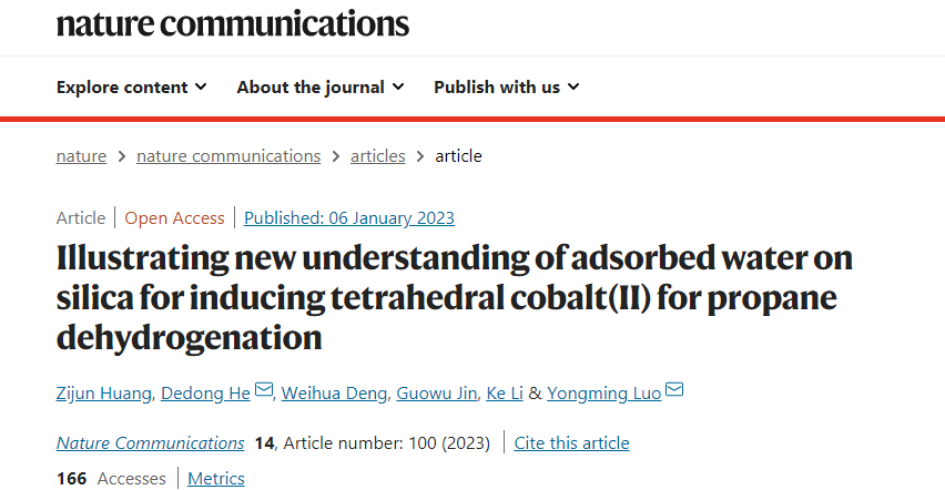 近日,昆明理工大學(xué)化學(xué)工程學(xué)院羅永明教授、何德東副教授在丙烷脫氫制丙烯的研究取得重要研究進(jìn)展,相關(guān)成果以Illustrating new understanding of adsorbed water on silica for inducing tetrahedral cobalt(II) for propane dehydrogenation為題,發(fā)表在國際頂級學(xué)術(shù)期刊Nature communications上。