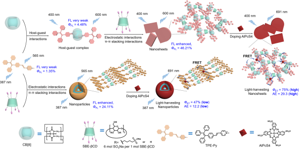 本研究基于TPE-Py、CB[8]、SBE-βCD和AlPcS4,通過主-客體相互作用、π- π相互作用和靜電相互作用等,構(gòu)建了高效的光捕獲超分子組裝體。該組裝體可控制納米粒子到納米薄片的拓?fù)湫蚊玻{(diào)控其多色發(fā)光。利用兩種大環(huán)化合物的共組裝策略不僅實(shí)現(xiàn)了客體熒光分子的發(fā)射光譜紅移,而且顯著增強(qiáng)了其熒光強(qiáng)度,并成功應(yīng)用于多色發(fā)光信息存儲(chǔ)和邏輯門的構(gòu)筑。