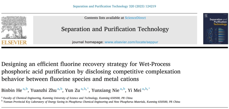 上述研究成果以《Designing anefficient fluorine recoverystrategy for wet-process phosphoric acid purification by disclosing competitive complexation behavior between fluorine species and metal cations》為題發(fā)表在化工領(lǐng)域TOP學(xué)術(shù)期刊《Separation and Purification Technology》上。昆明理工大學(xué)化學(xué)工程學(xué)院為論文第一署名單位,博士研究生何賓賓為論文第一作者,梅毅教授和祖運(yùn)副教授為論文共同通訊作者,該研究工作得到了國(guó)家自然科學(xué)基金、云南省基礎(chǔ)研究項(xiàng)目基金,云南省“興滇英才支持計(jì)劃”青年人才專項(xiàng)以及云南省磷化工節(jié)能與新材料重點(diǎn)實(shí)驗(yàn)室平臺(tái)的資助。
