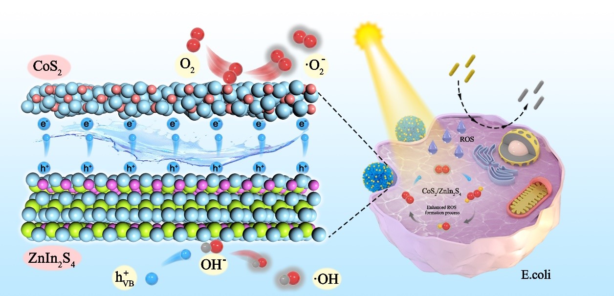 受助催化劑耦聯(lián)改性半導體在可見光驅(qū)動催化技術中擁有優(yōu)異性能的啟發(fā),采用二次水熱法利用助催化劑CoS2耦聯(lián)半導體ZnIn2S4構建肖特基異質(zhì)結進行材料重構,探究具有強大內(nèi)置電場和豐富表面活性位點的微晶材料的可見光驅(qū)動催化抗菌機理。CoS2/ZnIn2S4二者構建較強界面耦合,有效地抑制了光生電子/空穴對的復合,驅(qū)動電子定向快速轉(zhuǎn)移增強其可見光驅(qū)動抗菌效果。該研究為優(yōu)化此類新型硫系抗菌材料結構設計和高效細菌滅活機理開辟了新的研究思路(論文連接:DOI: 10.1016/j.jcis.2023.09.118)。