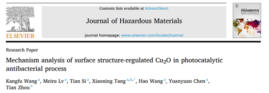 以不同表面結構的Cu2O單體作為研究對象,探究具有表面空位缺陷的微晶材料在光催化抗菌過程中的作用機理。采用液相還原法并調(diào)控配比制備出暴露(111)、(100)和(110)晶面的Cu2O光催化抗菌劑。不同表面調(diào)控改性的Cu2O光催化抗菌性能有著明顯差異,通過分子結構模型深度揭示了暴露表面原子結構在光催化抗菌過程中起的關鍵作用,可為光催化抗菌材料表面改性引起的構效關系提供一定技術價值(論文連接:DOI: 10.1016/j.jhazmat.2023.132479)。