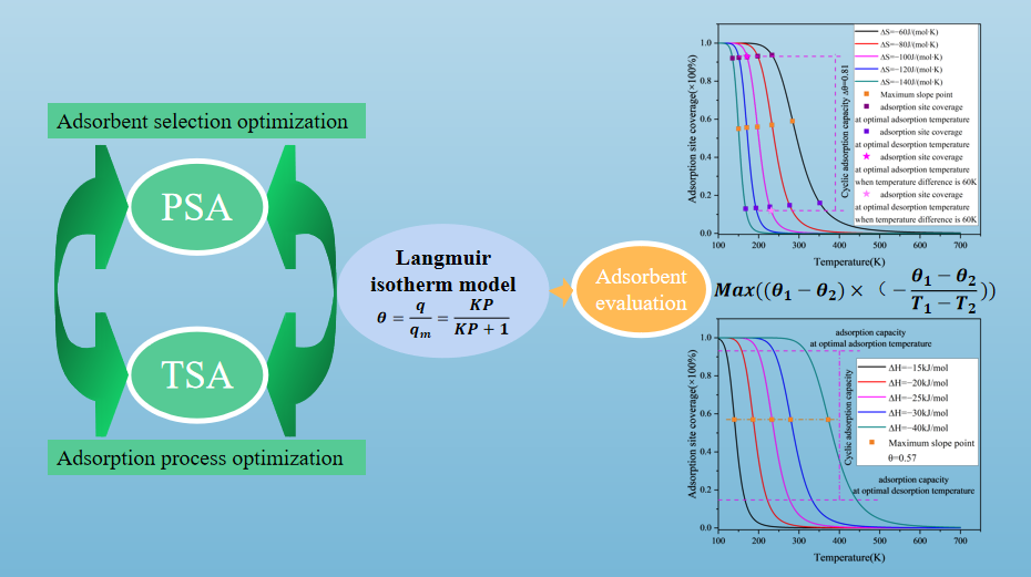 傳統(tǒng)方法主要在特定溫度下比較吸附劑的性能,精確衡量不同種類吸附劑的最佳吸附條件通常需要進行大量的試驗探索。分子分離與催化團隊通過研究現(xiàn)有文獻中的吸附數(shù)據,發(fā)現(xiàn)引入Langmuir模型結合吸附等溫線,能夠準確獲取變壓吸附(PSA)和變溫吸附(TSA)工藝過程中的最佳吸附條件及熱力學參數(shù)(熵變和焓變)值。通過建立函數(shù)模型,能夠有效量化不同吸附劑的最佳吸附工藝條件。這一函數(shù)模型不僅為尋找高效吸附過程的最優(yōu)條件提供了新方法,同時也為評估不同材料的吸附性能建立了可行的方案。