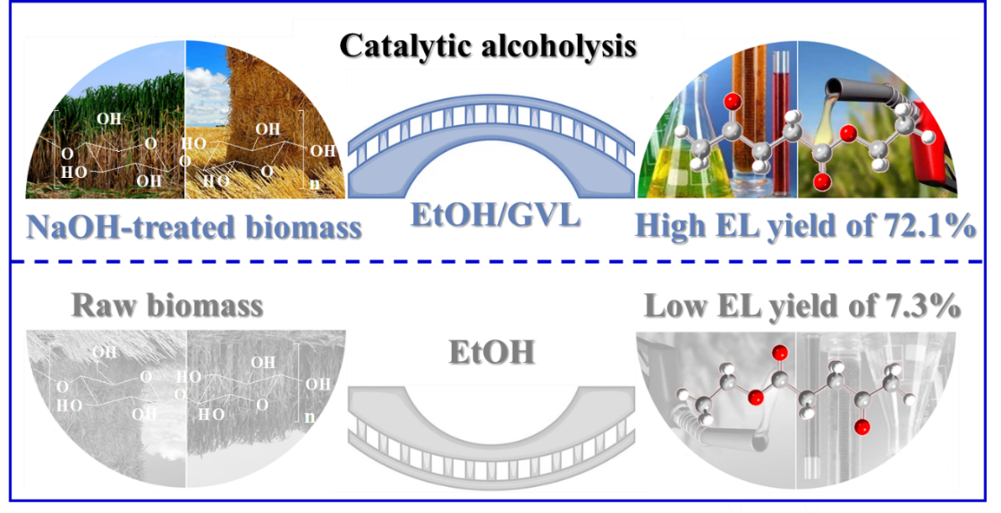 研究進(jìn)展二:針對木質(zhì)纖維生物質(zhì)原料組分多樣和結(jié)構(gòu)復(fù)雜,催化制備乙酰丙酸酯產(chǎn)物收率低等問題,團(tuán)隊開發(fā)了一種通過預(yù)處理生物質(zhì)原料結(jié)合綠色共溶劑介導(dǎo)催化反應(yīng)的串聯(lián)體系,可使巨菌草桿中纖維素高效催化轉(zhuǎn)化成乙酰丙酸酯,產(chǎn)物收率高達(dá)72%。通過反應(yīng)過程及動力學(xué)研究揭示了水洗預(yù)處理和γ-戊內(nèi)酯共溶劑在促進(jìn)生物質(zhì)原料中纖維素催化轉(zhuǎn)化的作用機(jī)理。該成果為從生物質(zhì)原料制備酯類化合物提供了一種綠色、簡單且高效的方法。