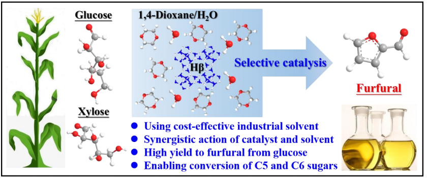 研究進(jìn)展一:目前糠醛工業(yè)生產(chǎn)僅可利用生物質(zhì)原料中的五碳糖,剩余的大量纖維素及其衍生的六碳糖未被有效利用。團(tuán)隊開發(fā)了一種利用工業(yè)級Hβ沸石在1,4-二氧六環(huán)/水混合溶劑體系中同時轉(zhuǎn)化五碳糖和六碳糖為糠醛的新策略,產(chǎn)物收率可達(dá)63%。研究揭示了1,4-二氧六環(huán)和水在六碳糖轉(zhuǎn)化為糠醛中的重要作用,它們協(xié)同催化劑促使葡萄糖C-C鍵發(fā)生定向斷裂,實現(xiàn)產(chǎn)物選擇性合成。該成果可為生物質(zhì)組分有效利用制備糠醛提供理論支撐與方法借鑒。