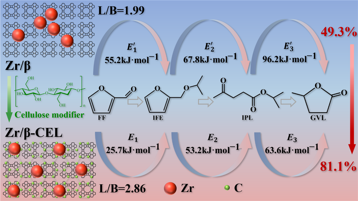 研究進(jìn)展四:γ-戊內(nèi)酯是一種先進(jìn)的新能源化學(xué)品,具有廣泛的工業(yè)應(yīng)用價值,可作為燃料添加劑、潤滑劑、增塑劑、有機(jī)溶劑、以及生產(chǎn)烯烴和聚合物的前驅(qū)體。團(tuán)隊以糠醛為反應(yīng)原料,采用纖維素碳作為Zr/β分子篩的改性劑,制備成多功能高性能催化劑,利用“一鍋法”策略在無外源氫氣條件下實現(xiàn)了糠醛直接到γ-戊內(nèi)酯的綠色高效轉(zhuǎn)化,產(chǎn)物收率從49%提升到81%。研究表明:使用纖維素作為碳改性劑有利保持β分子篩的結(jié)構(gòu)完整性、增大催化劑介孔體積和孔徑,從而提高活性位點(diǎn)可及性和利于反應(yīng)物/產(chǎn)物擴(kuò)散。研究成果可為糠醛提質(zhì)制備γ-戊內(nèi)酯提供理論與技術(shù)指導(dǎo)。