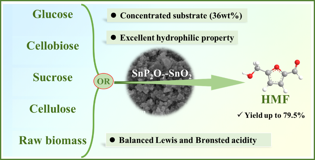 研究進(jìn)展三:針對催化生物質(zhì)原料制備5-羥甲基糠醛底物濃度低的問題,團(tuán)隊開發(fā)了一種具有SnP2O7和SnO2混合結(jié)構(gòu)的錫基催化劑,該催化劑在催化轉(zhuǎn)化高濃碳水化合物以及生物質(zhì)原料(36~72wt%)制備5-羥甲基糠醛方面展現(xiàn)出優(yōu)異的催化反應(yīng)活性,產(chǎn)物收率可達(dá)45~79%。研究發(fā)現(xiàn)該催化劑具備恰當(dāng)?shù)乃嵝詮?qiáng)度、酸性位點(diǎn)種類和超親水性,它們的協(xié)同作用有助于高底物濃度生物質(zhì)原料的催化轉(zhuǎn)化,可為5-羥甲基糠醛的高效制備提供理論與技術(shù)參考。