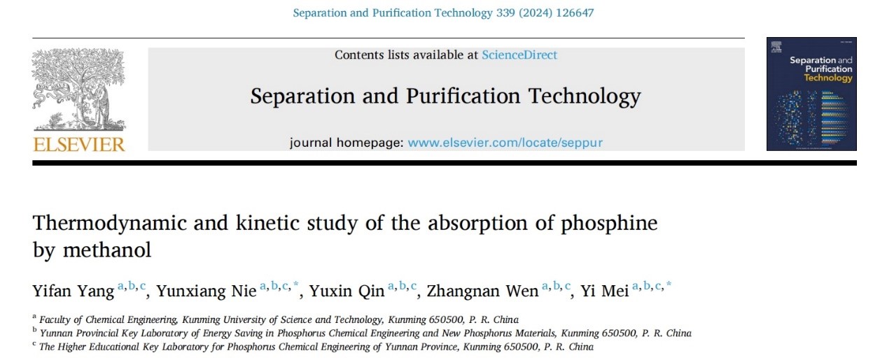 2024年2月,昆明理工大學(xué)化學(xué)工程學(xué)院、云南省磷化工節(jié)能與新材料重點(diǎn)實(shí)驗(yàn)室在化學(xué)工程領(lǐng)域知名期刊Separation and Purification Technology上發(fā)表了題為“Thermodynamic and kinetic study of the absorption of phosphine by methanol”的研究論文,昆明理工大學(xué)化學(xué)工程學(xué)院梅毅教授和聶云祥為論文共同通訊作者,博士研究生楊一帆為論文第一作者。
