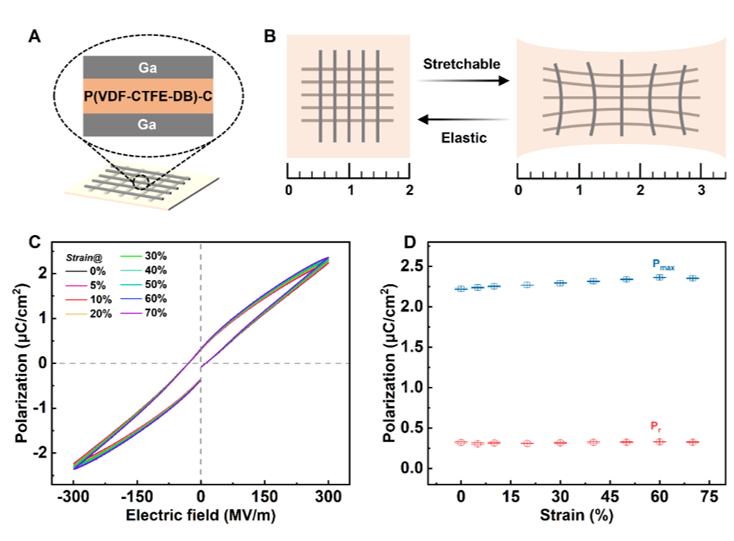 本研究以弛豫性鐵電聚合物聚偏氟乙烯-三氟氯乙烯[P(VDF-CTFE)]為研究對(duì)象,在前期研究的基礎(chǔ)上,作者利用巰基-烯點(diǎn)擊反應(yīng),實(shí)現(xiàn)了含雙鍵的弛豫性鐵電聚合物P(VDF-CTFE-DB)與含巰基的交聯(lián)劑TMPMP的交聯(lián),構(gòu)建了聚合物網(wǎng)狀結(jié)構(gòu),從而實(shí)現(xiàn)了弛豫性鐵電體的本征彈性化。交聯(lián)后的鐵電薄膜斷裂伸長率達(dá)260%,在50%應(yīng)變的疲勞測試中,該彈性弛豫鐵電薄膜在3,000次應(yīng)變循環(huán)后仍能保持80%的應(yīng)變回復(fù)率,與市售的氟彈性體P(VDF-HFP)相近。通過對(duì)交聯(lián)薄膜進(jìn)行電學(xué)性能表征,驗(yàn)證了交聯(lián)薄膜在較寬頻率內(nèi)穩(wěn)定的鐵電響應(yīng)。最終,以該彈性弛豫性鐵電體薄膜為介質(zhì)層制備的全彈性鐵電器件在70%應(yīng)變下展現(xiàn)了穩(wěn)定的鐵電響應(yīng),進(jìn)一步驗(yàn)證了該彈性弛豫鐵電薄膜應(yīng)用于可穿戴設(shè)備的可能性。本研究為構(gòu)建本征彈性弛豫鐵電材料提供了一個(gè)簡便、高效的新思路。