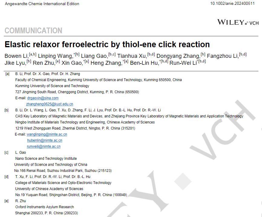 近日,昆明理工大學(xué)化學(xué)工程學(xué)院張恒正高級(jí)實(shí)驗(yàn)師課題組和中國科學(xué)院寧波材料技術(shù)與工程研究所柔性磁電功能材料與器件團(tuán)隊(duì)合作,在鐵電材料彈性化領(lǐng)域取得重要研究進(jìn)展,相關(guān)成果以“Elastic relaxor ferroelectric by thiol-ene click reaction”為題發(fā)表在國際化學(xué)頂級(jí)期刊《Angewandte Chemie International Edition》上。昆明理工大學(xué)為論文第一完成單位及通訊單位,化學(xué)工程專業(yè)2021級(jí)碩士研究生李博文為論文第一作者,張恒正高級(jí)實(shí)驗(yàn)師和高欣副教授為論文共同通訊作者。