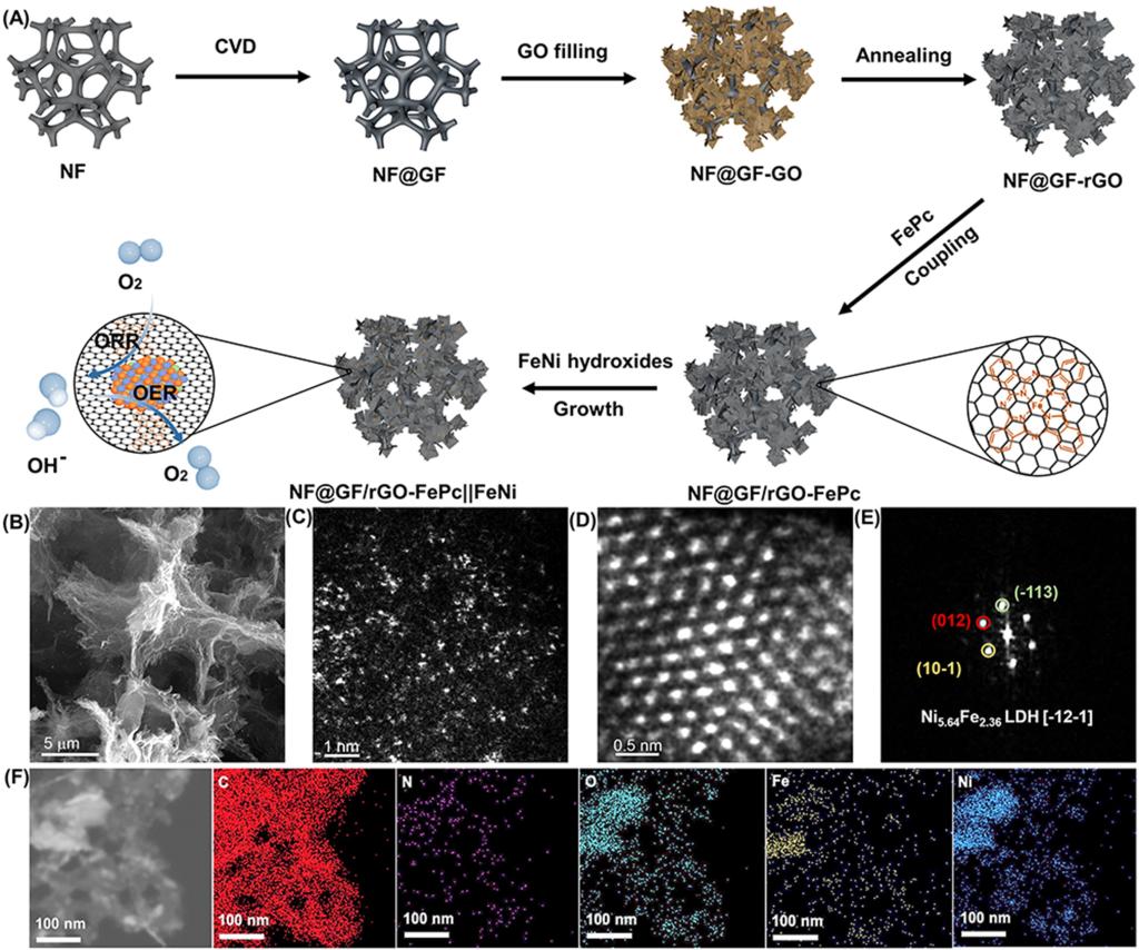 基于此,本工作提出自支撐三維互連石墨烯網(wǎng)絡(luò)錨定Fe-N4團(tuán)簇和FeNi氫氧化物作為空氣電極的策略,通過在泡沫鎳上催化生長石墨烯并將還原氧化石墨烯填充到泡沫孔隙中,形成了一個(gè)傳質(zhì)速率快且高導(dǎo)電性的三維互連石墨烯網(wǎng)絡(luò),隨后利用該網(wǎng)絡(luò)錨定含有Fe-N4位點(diǎn)(鐵酞菁)和FeNi氫氧化物,分別用于促進(jìn)放電過程中的ORR和充電過程中的OER,實(shí)現(xiàn)高性能多功能空氣電極的構(gòu)建。實(shí)驗(yàn)研究結(jié)合理論研究證明了研制的空氣電極在水系和柔性固態(tài)ZABs應(yīng)用上具有良好的實(shí)用性,并揭示其高電催化活性的內(nèi)在原因。