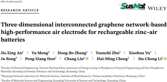 上述研究以“Three-Dimensional Interconnected Graphene Network-Based High-Performance Air Electrode for Rechargeable Zinc-Air Batteries”為題,發(fā)表在SusMat(IF=28.4)上。論文的第一作者為我院2021級(jí)碩士研究生安佳興,通訊作者為我院李金成副教授、昆明理工大學(xué)材料學(xué)院榮菊副教授及中國科學(xué)院金屬研究所劉暢研究員。該研究工作得到了國家自然科學(xué)基金(52102046)及云南省優(yōu)秀青年基金項(xiàng)目(202301AW070016)的資助。