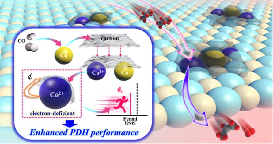 近年來,丙烷直接脫氫(PDH)反應被認為是最有前景的丙烯生產工藝之一,基于頁巖氣資源稟賦,云南省發(fā)展和改革委員會等多部門在《云南省新材料產業(yè)發(fā)展三年行動(2022-2024年)》中將丙烷脫氫催化劑的研發(fā)明確為重點任務之一。在PDH反應中,碳-金屬結合能通常被認為是預測烷烴活化過程中碳氫鍵吸附能的描述符,并且與金屬的d帶中心相關。基于此,羅永明教授和何德東教授團隊巧妙利用一氧化碳在金屬鈷上的歧化反應及其原位產生的碳層來調控活性Co(II)的電荷密度。相關實驗和理論計算結果表明,預沉積的碳層降低了四面體Co(II)的電子密度,使其d帶中心更接近費米能級,有利于丙烷脫氫反應中速控步驟C-H的活化。本研究為碳物種調控活性金屬的電子環(huán)境和開發(fā)高性能鈷基PDH催化劑的研究提供了新的學術視角,是羅永明教授和何德東教授團隊繼Nat. Commun., 14, 100, 2023后的又一項重要研究成果。
