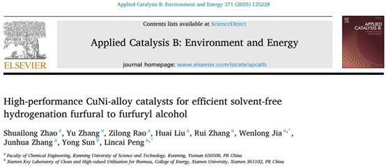 近日,化學(xué)工程學(xué)院生物質(zhì)化工團(tuán)隊(duì)在半纖維素基糠醛催化加氫制備糠醇方面取得重要研究進(jìn)展,實(shí)現(xiàn)了無溶劑條件下糠醛的高效選擇性加氫。相關(guān)研究成果以“High-performance CuNi-alloy catalysts for efficient solvent-free hydrogenation furfural to furfuryl alcohol”為題發(fā)表在環(huán)境與能源領(lǐng)域國際權(quán)威TOP期刊《Applied Catalysis B: Environment and Energy》上(IF=20.2)。昆明理工大學(xué)化學(xué)工程學(xué)院為論文第一完成單位,我院碩士研究生趙帥龍為論文第一作者,賈文龍博士和彭林才教授為論文通訊作者。