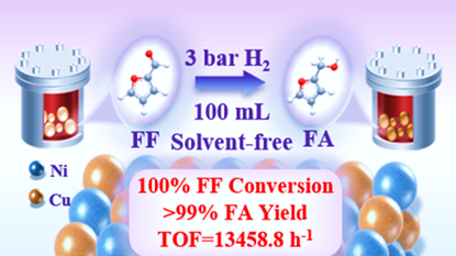 基于此,生物質(zhì)化工團(tuán)隊(duì)構(gòu)建了一類高效NiCu合金催化劑,可在無溶劑和溫和條件(110 ℃、0.3 MPa H2)下,使糠醛選擇性加氫生成糠醇。其中,Cu1Ni1Ox/C催化劑的轉(zhuǎn)換效率TOF值高達(dá)13458.8 h?1,顯著優(yōu)于已報(bào)道的反應(yīng)體系(<6273 h?1)。同時(shí),當(dāng)反應(yīng)體系放大至100 mL時(shí),糠醇產(chǎn)率仍保持在99%以上,顯示出優(yōu)良的工業(yè)應(yīng)用前景。機(jī)理研究表明:Ni0(111)晶面主導(dǎo)H2均相解離及糠醛的η2(O)-醛模式吸附,而銅摻雜使催化劑d帶中心上移,優(yōu)化底物吸附構(gòu)型和降低反應(yīng)能壘,它們之間的合金效應(yīng)增強(qiáng)活性位點(diǎn)穩(wěn)定性。進(jìn)一步研究發(fā)現(xiàn),該催化劑具有廣譜適用性,可拓展至多種醛酮衍生物的無溶劑加氫反應(yīng)。該研究工作從電子結(jié)構(gòu)調(diào)控角度深化了對(duì)CuNi合金催化劑界面作用機(jī)制的認(rèn)識(shí),并為用于醛酮化合物無溶劑氫化的高效催化劑設(shè)計(jì)提供了科學(xué)依據(jù)。