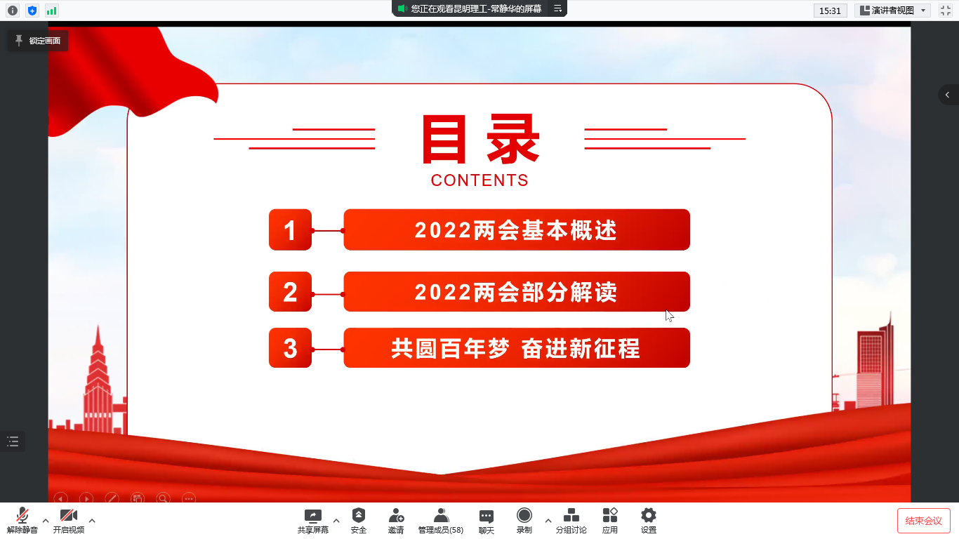 常老師代領(lǐng)與會(huì)同志共同學(xué)習(xí)了“兩會(huì)”的基本概念,學(xué)習(xí)了2022年全國兩會(huì)的總體情況。重點(diǎn)解讀了李克強(qiáng)總理在政府工作報(bào)告中提及的教育相關(guān)的內(nèi)容。“促進(jìn)教育公平與質(zhì)量提升。”“落實(shí)立德樹人根本任務(wù)。”“著力保障和改善民生,加快發(fā)展社會(huì)事業(yè)。”等與教育相關(guān)的內(nèi)容為大家留下了深刻的印象。