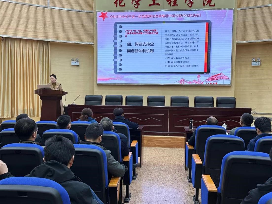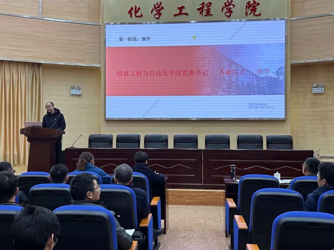 為深入學(xué)習(xí)貫徹黨的二十屆三中全會(huì)精神、全國(guó)教育大會(huì)精神,2024年11月28日下午,化學(xué)工程學(xué)院黨委和信息工程與自動(dòng)化學(xué)院黨委共同舉辦了理論學(xué)習(xí)中心組聯(lián)合集中學(xué)習(xí)。校黨委副書(shū)記陳華仙同志、宣傳部部長(zhǎng)王仁強(qiáng)同志進(jìn)行學(xué)習(xí)指導(dǎo),化工學(xué)院、信自學(xué)院理論學(xué)習(xí)中心組成員,化工學(xué)院、信自學(xué)院學(xué)術(shù)團(tuán)隊(duì)負(fù)責(zé)人,化工學(xué)院全體黨支部書(shū)記、支委,化工學(xué)院各系主任、副主任、科室負(fù)責(zé)人以及化工學(xué)院近三年進(jìn)校的青年教師等70余人參加學(xué)習(xí)。