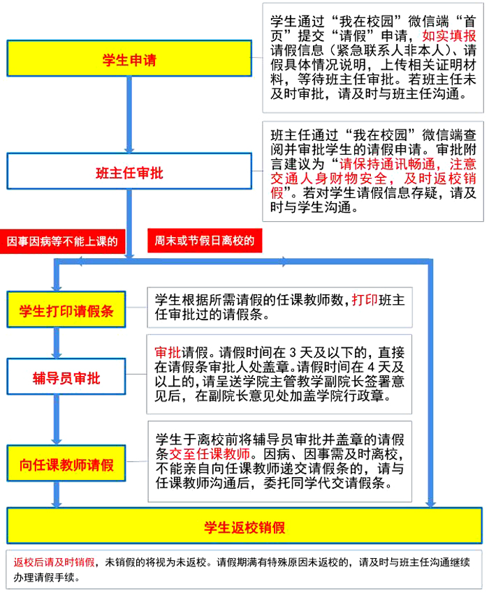 周末或節(jié)假日離校的(寒暑假另行安排),需要辦理“學(xué)生申請(qǐng)—班主任審批—學(xué)生返校銷假”手續(xù)。