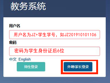 家長(zhǎng)可以訪問(wèn)昆明理工大學(xué)學(xué)分制教學(xué)服務(wù)平臺(tái)(http://jwctsp.kmust.edu.cn/integration/login),輸入用戶名和密碼(用戶名為JZ+學(xué)生學(xué)號(hào),如JZ201910101106,密碼為學(xué)生身份證后6位),點(diǎn)擊“外聘/家長(zhǎng)登錄”,查詢學(xué)生的課程安排、成績(jī)明細(xì)、培養(yǎng)方案等信息。