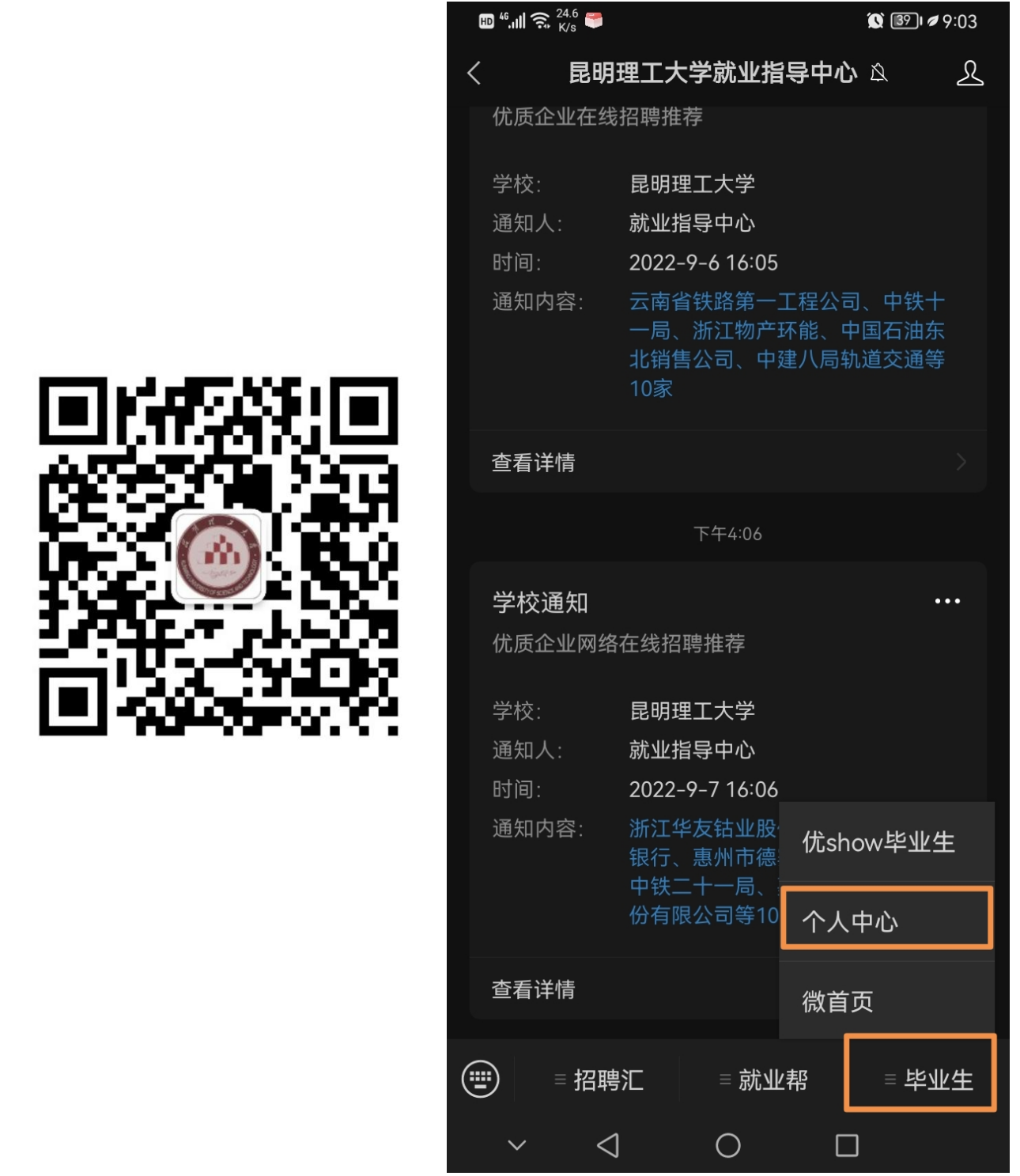 畢業(yè)生可登陸昆明理工大學(xué)就業(yè)網(wǎng)http://job.kmust.edu.cn/,或微信識別二維碼,關(guān)注“昆明理工大學(xué)就業(yè)指導(dǎo)中心”微信號,通過“微信公眾號——畢業(yè)生——個人中心——生源信息”核對信息,注意事項如下: