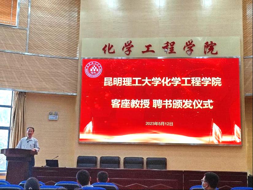 2023年5月12日13:30,化學(xué)工程學(xué)院在化工樓100報告廳舉行了邢愛民客座教授聘書頒發(fā)儀式。云南能投集團(tuán)正高工邢愛民、化學(xué)工程學(xué)院黨委書記李云燕、副院長李斌、裝控系系主任陳飛、教師代表陳濤、何云飛出席活動,學(xué)院本科生、研究生代表共計100余人參與了本次活動,活動由李斌副院長主持。